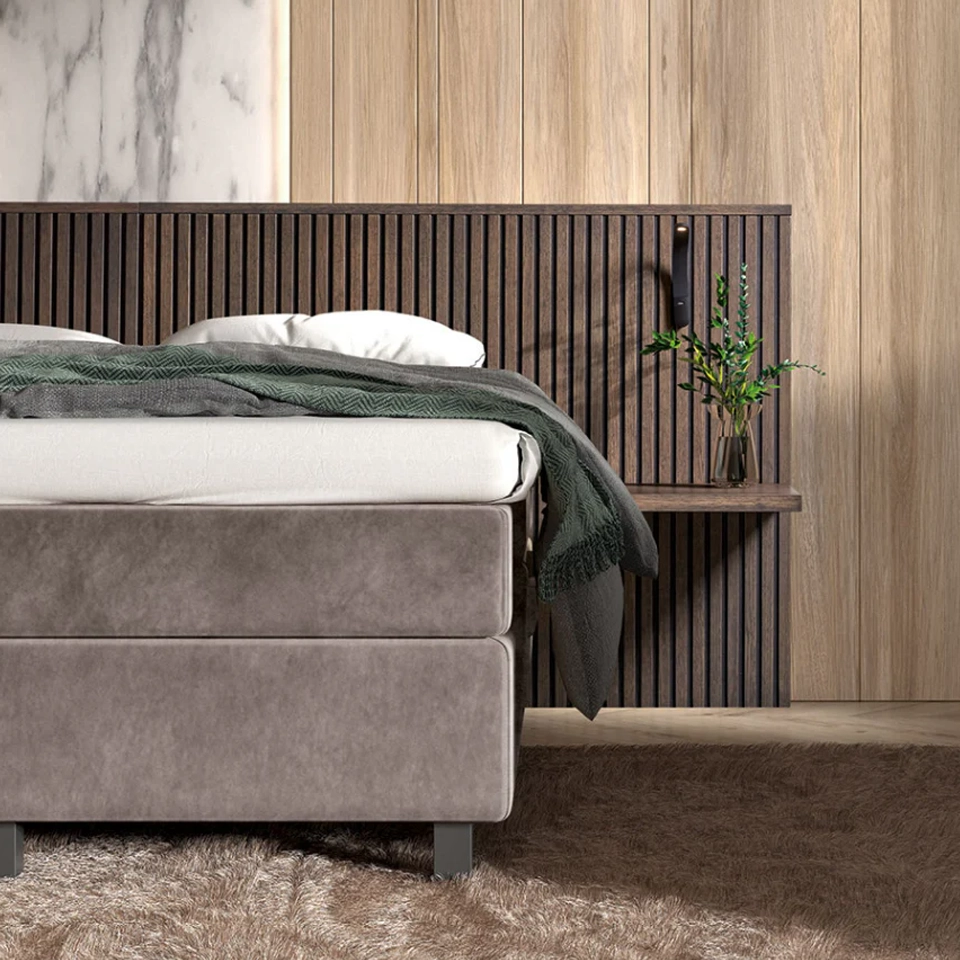 Het tweedelige hoofdbord Marriot is een stijlvolle en tijdloze uitvoering die momenteel in onze showroom te zien is. Dit model is uitgevoerd met aanhang-nachttafels met één lade en met LED-verlichting met USB oplaad functie. Dit hoofdbord Marriot combineert een moderne uitstraling met praktische details.