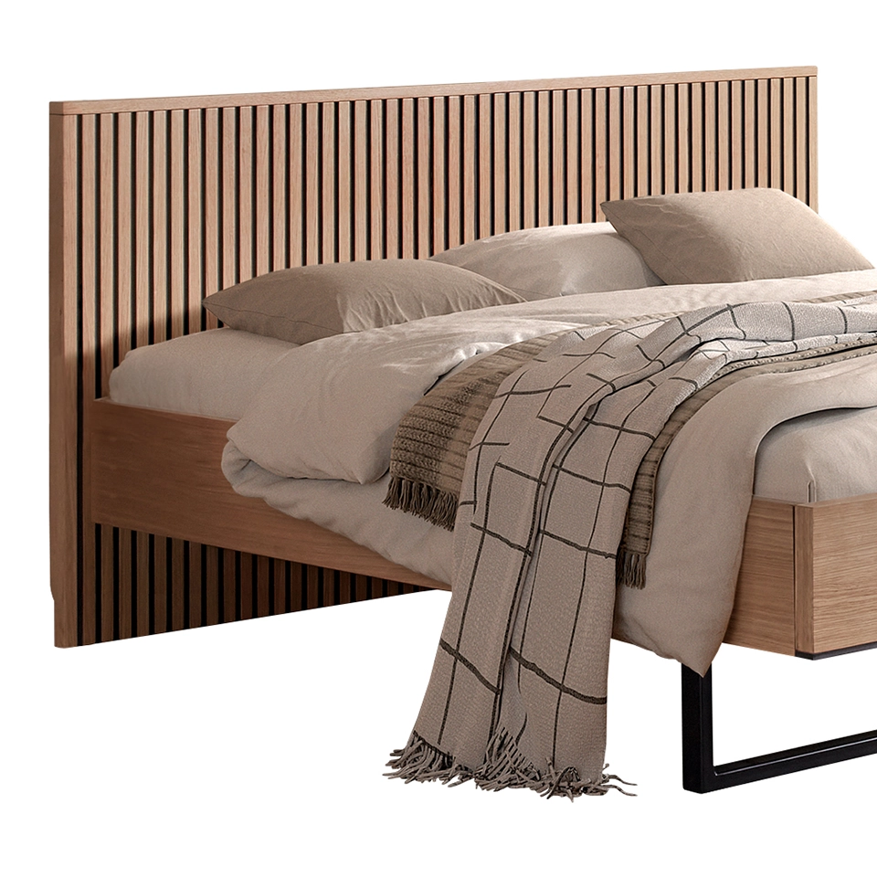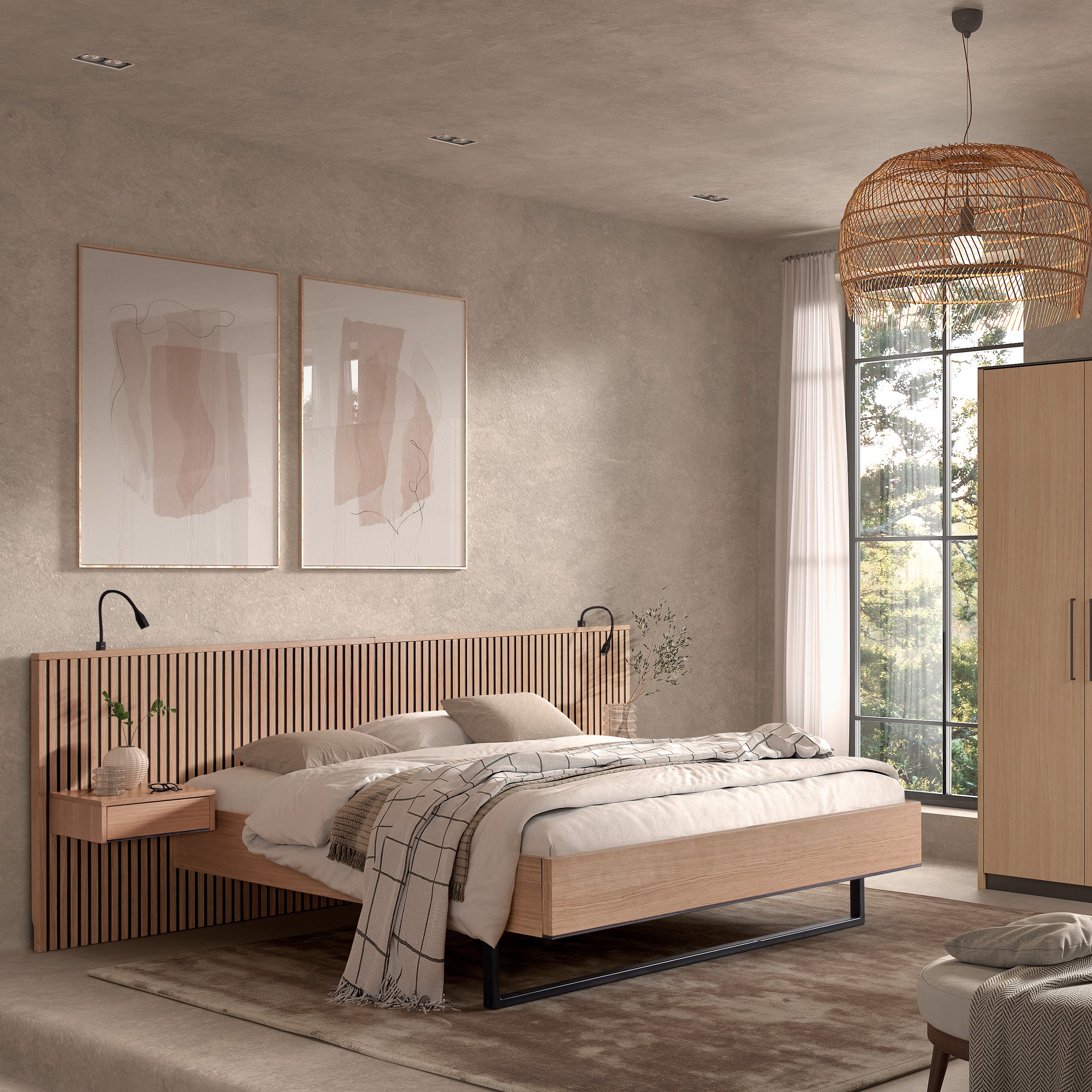 Het hoofdbord is in meerdere breedtematen leverbaar en verkrijgbaar in drie fraaie houtkleuren: eiken naturel, eiken mice grey en eiken white wash. Er zijn meerdere mogelijkheden qua nachtkastjes en commodes. Zo stemt u het bed eenvoudig af op de stijl van uw slaapkamer.