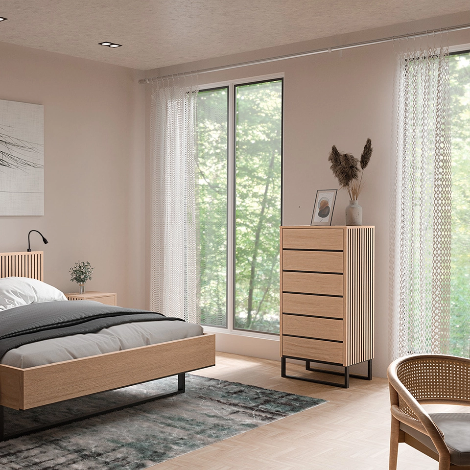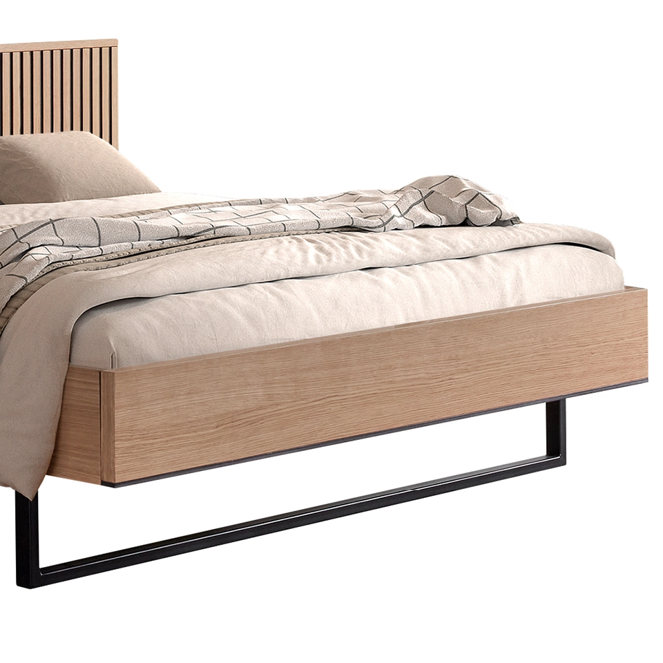 Het ledikant Marriott is een elegant en tijdloos model dat momenteel in onze showroom te zien is. Deze uitvoering heeft een afmeting van 180 x 200 cm en is uitgevoerd in eiken naturel, wat zorgt voor een warme en natuurlijke uitstraling. Het bed is voorzien van een tweedelig hoofdbord Marriott en hangende nachtkastjes met één lade, wat het geheel een moderne en luchtige uitstraling geeft.